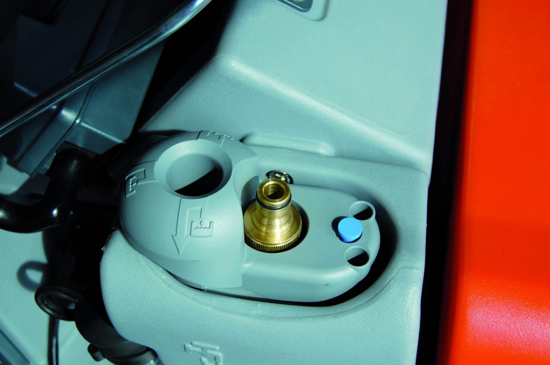 Zur automatischen Befüllung wird der Schlauch mit einer einfachen Kupplung an der Reinigungsmaschine befestigt. Wenn der Frischwassertank vollständig gefüllt ist, wird die Wasserzufuhr automatisch gestoppt. Während der Füllzeit kann der Bediener andere Arbeiten verrichten und muss nicht bei der Maschine bleiben, was zu mehr Effizienz führt.